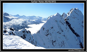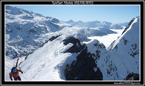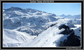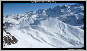 Nous attaquons la descente vers 12 h 45, les jambes fatiguent rapidement avec cette neige bien dure mais tout se skie relativement bien. Dans les quelques orientations plein Sud et à l'abri du vent, la neige a eu le temps de décailler et c'est bien bon !