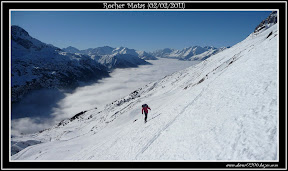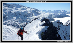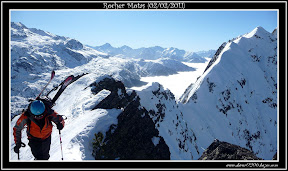 Nous montons tranquillement en conversions sans suivre les anciennes traces qui sont bien gelées. Nous mettons ensuite les couteaux pour plus de confort jusqu'au Col où les derniers mètres ravagés par les traces suite aux très nombreux passages sont relativement durs. A l'abri du vent, nous en profitons pour manger un bout. Du Col nous terminons skis sur le sac jusqu'au sommet où le vent souffle de plus belle.