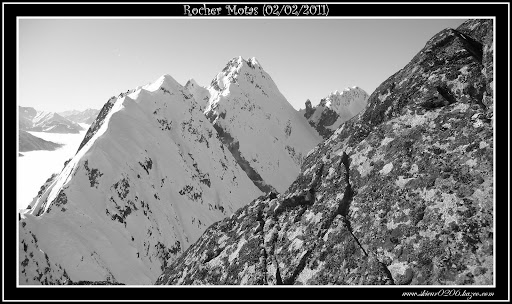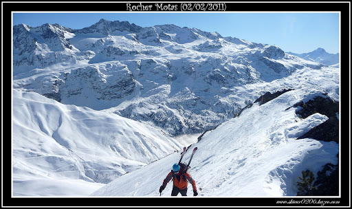 ^ L'arrivée au sommet skis sur le sac / En arrière plan, le Massif des Grandes-Rousses