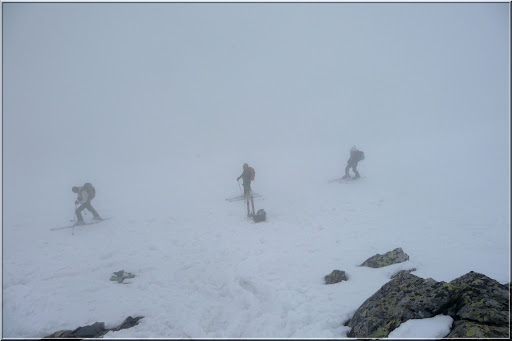 Très belle course, mais hélas, la météo s'est trompée, brouillard total au sommet, visibilité donc très réduite. Le panorama sera pour une prochaine fois. Nous sommes partis vers 7 h 20 du parking et nous atteignons le sommet vers 10 h 20. La pente finale en neige dure passe à skis (mais limite, certains montèrent à pied). Nous sommes seuls au sommet avec un couple de Voiron très sympathique. Après une belle pause, nous attaquons la descente dans le brouillard et croisons une quinzaine de personnes sur la route du sommet. Le couloir du bas n'est pas pire, malgrés de nombreuses boulettes suite aux coulées anciennes, mais le ski reste bon. Le reste de la descente s'effectue sur une moquette juste revenue comme il faut pour bien se faire plaisir. Border cross en bon état mais l'enneigement devient limite sur le bas... Le soleil est de retour dans la vallée avec 20 °C à Grenoble, alors que 2 h auparavant nous étions sous la neige au sommet ! |